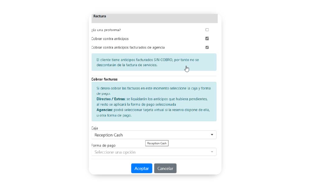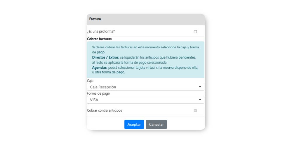 Desde la ficha de la reserva te permitirá cobrar las facturas con ciertas restricciones. Cuando la reserva es de Tipo Agencia, y seleccionan “Alojamiento + Cargos de habitación”, no aparecerá la opción de cobrar. Cuando se cobren facturas de alojamiento de reservas de tipo agencia con los métodos que cargan tarjetas de crédito, esta solo cargará la tarjeta vinculada a la reserva como hace en la ficha de facturas y si se cobra cargos habitación, aparecerán las de listado de tarjetas de crédito. Si la reserva es de Tipo directos, aparecerán todas las opciones.