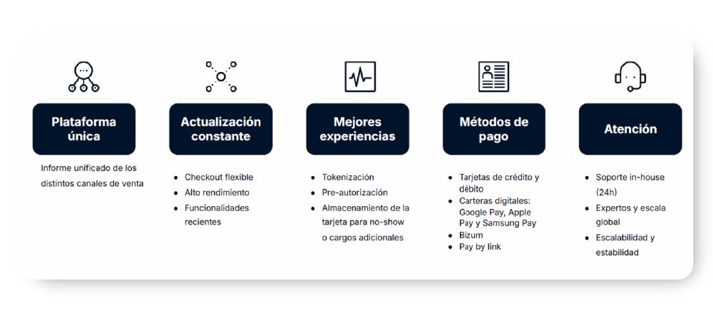 - Plataforma de pagos unificada: Un sistema que integra todos los pagos del hotel, desde las reservas en línea y la web hasta los gastos en restaurantes, bares, spas y el check-out final. Esto permite un enfoque cohesionado y eficiente para gestionar todas las transacciones.
