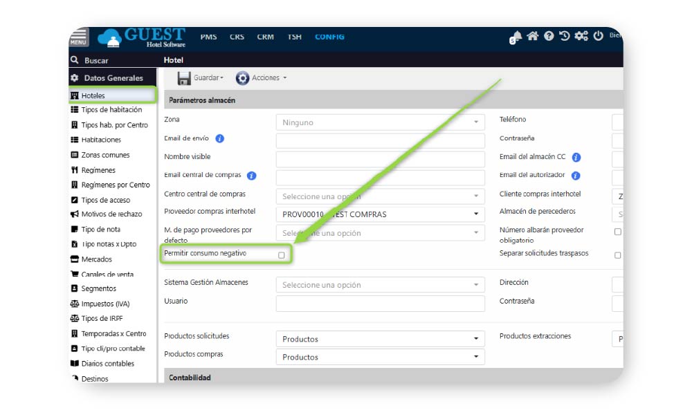 Cada hotel tendrá la opción de permitir o no, con el registro de consumos negativos en los inventarios. Esta opción deberá ser configurada a nivel de Centro en la sección CONFIG (Datos Generales – Hoteles). Si el hotel desea trabajar con esta operativa, la casilla de verificación “Permitir consumo negativo” de la sección “Parámetros Almacén” deberá activarse: