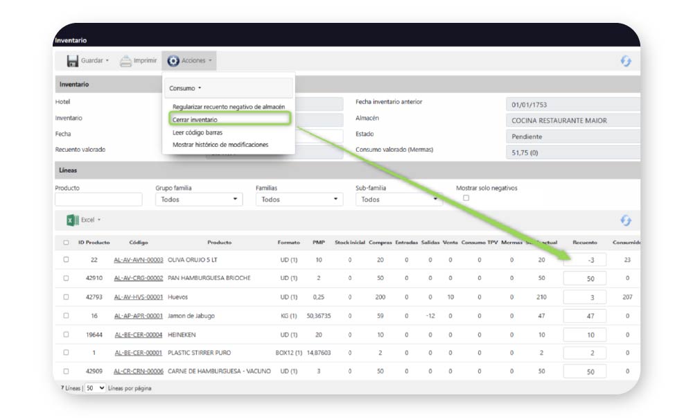 Una vez habilitada esta opción, se podrán cerrar los inventarios registrando recuentos negativos: