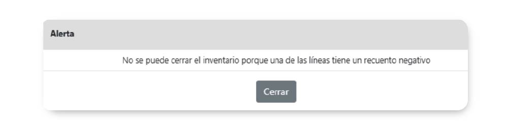 En caso contrario, si esta opción no se encuentra habilitada, al momento de tratar de cerrar el inventario con un recuento en negativo, aparecerá el siguiente aviso:
