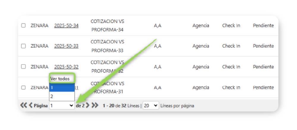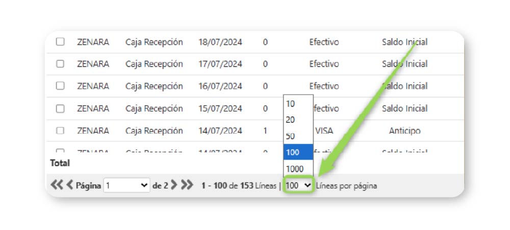 La configuración del número máximo de líneas que por defecto podrás visualizar, serán 100 filas. Sin embargo, recuerda que en cada página, podrás modificar el número de filas que deseas visualizar dando clic en la siguiente opción: